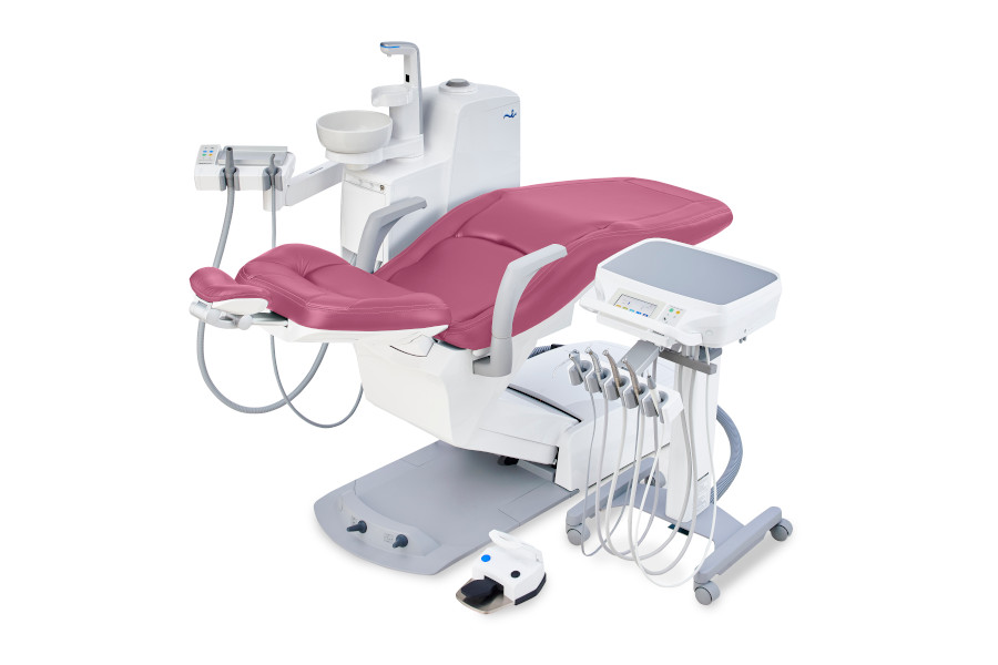 Rear-mounted delivery arm vertical range 525-1505 mm horizontal rotation 90° touch-screen control panel 4-5 handpieces (3 FO + 1 non-optic) luxury autoclavable holders 3-way syringe oil mist collector water heater priority handpiece selection electronic foot pedal RPM/torque memory USB integration.