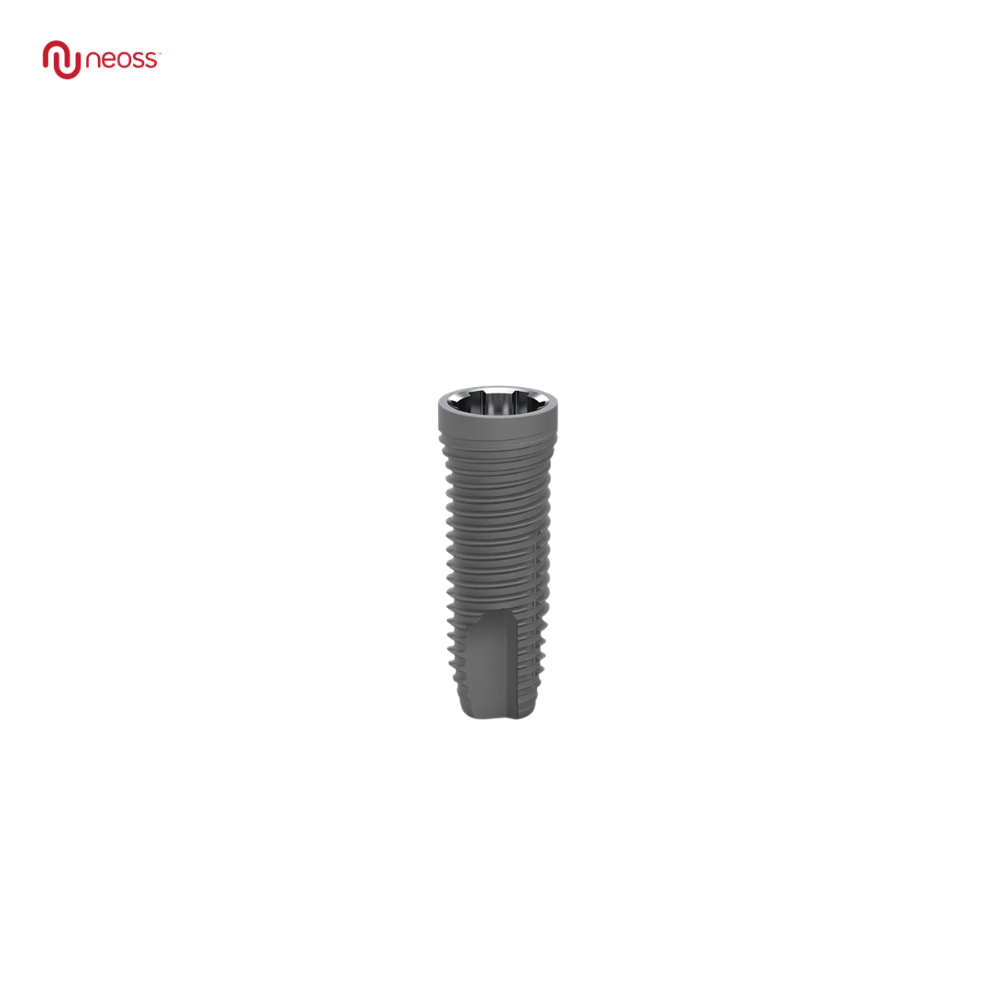 Neoss ProActive® Straight ขนาดเส้นผ่านศูนย์กลาง 3.5 mm ผลิตจากไทเทเนียมบริสุทธิ์ Grade IV (Commercially Pure Titanium) โดดเด่นด้วยรูปทรงกระบอกขนาน (Parallel-walled) ที่ช่วยให้ทันตแพทย์ควบคุมทิศทางและความลึกในการฝังได้อย่างแม่นยำ เหมาะอย่างยิ่งสำหรับเคสที่มีพื้นที่จำกัดหรือสันกระดูกแคบ (Narrow Ridges) โดยยังคงประสิทธิภาพการกระจายแรงบดเคี้ยวได้อย่างสมดุลลงสู่เนื้อกระดูกรอบรากเทียม