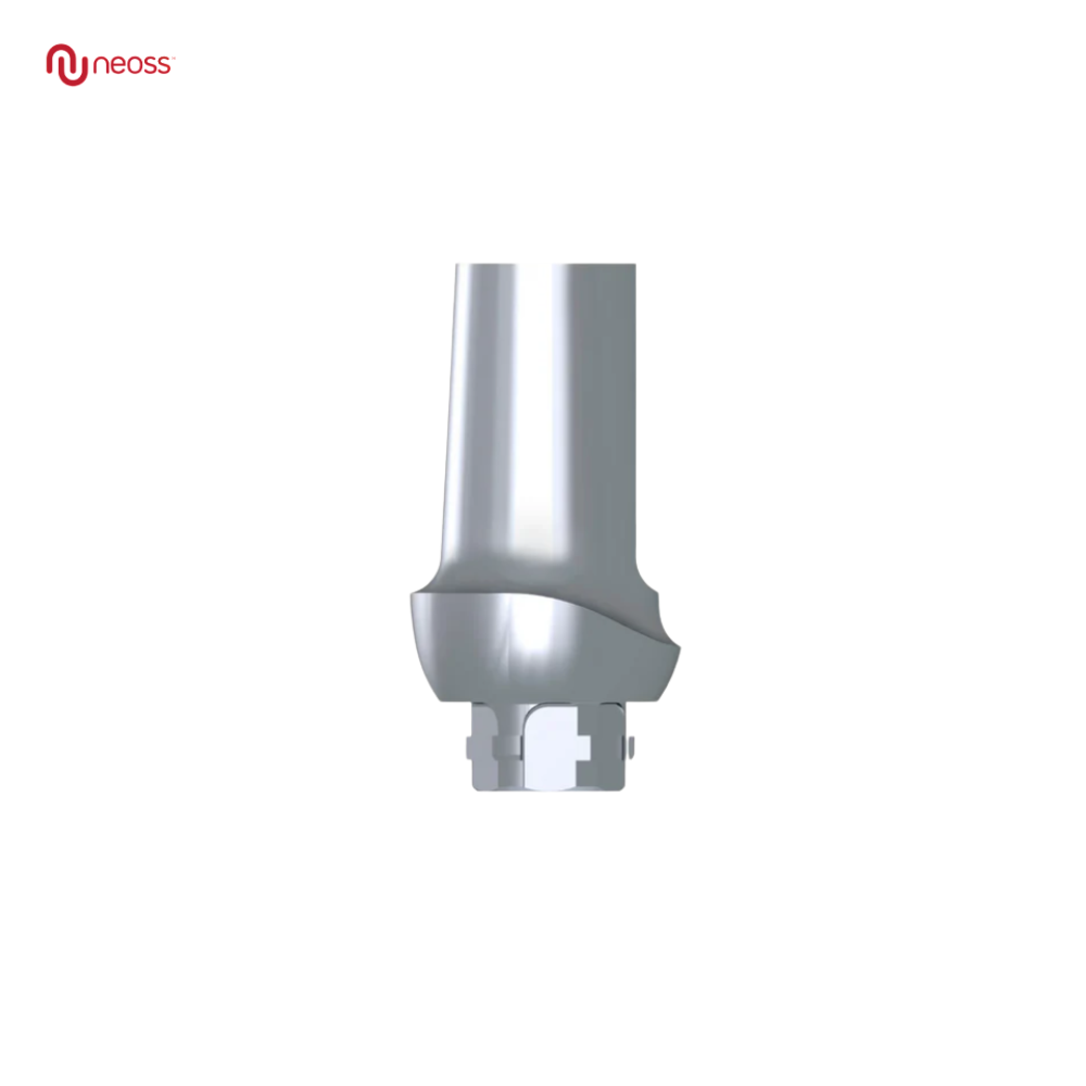 อะบัตเมนต์ไทเทเนียมชนิดปรับแต่งได้แบบตรง 0 องศา คอสูง 1 มม. จากระบบ Neoss ออกแบบพิเศษฐานเพรียวบาง สำหรับงานครอบฟันหน้าซี่เล็กหรือบริเวณที่มีพื้นที่จำกัด