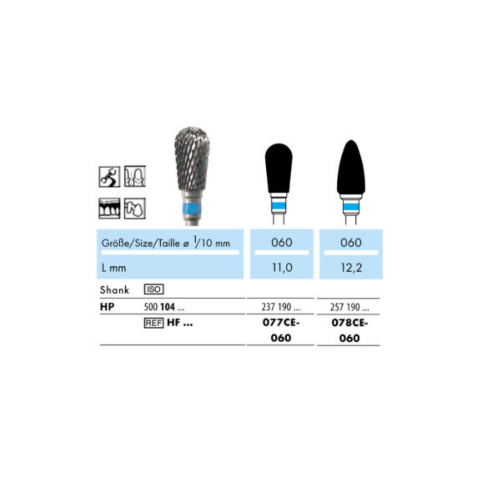 หัวกรอทังสเตนคาร์ไบด์ชนิดก้าน HP รูปทรงกระสุน (078) ซี่ฟันตัดแบบไขว้มาตรฐาน (Standard Cross Cut) ออกแบบมาเพื่อการกรอแต่งรูปร่างและลดขนาดวัสดุโลหะ อะคริลิก และปูนปลาสเตอร์ในงานทันตกรรมประดิษฐ์