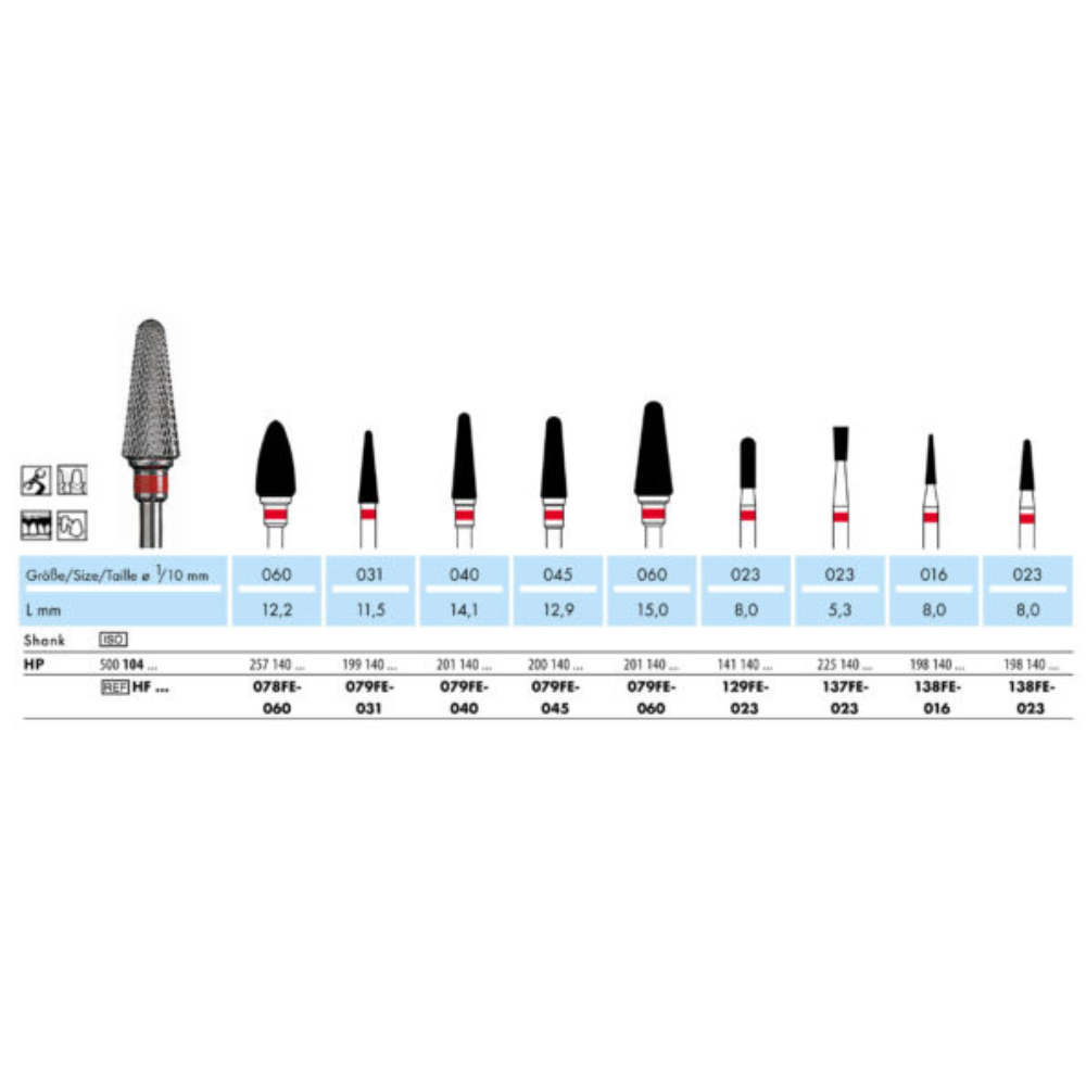 NTI Tungsten Carbide Cutter รหัส HF079FE-045 เป็นเครื่องมือหมุนกลุ่มหัวกรอคาร์ไบด์ประสิทธิภาพสูงจากประเทศเยอรมนี ออกแบบมาเพื่อรองรับการทำงานในห้องปฏิบัติการทันตกรรม (Dental Laboratory) และการปรับแต่งชิ้นงานนอกช่องปาก (Extra-oral adjustment) ตัวก้านเป็นชนิด HP ที่มีความเที่ยงตรงระดับไมครอน ช่วยยึดเกาะกับ Micromotor ได้อย่างมั่นคงและปลอดภัย