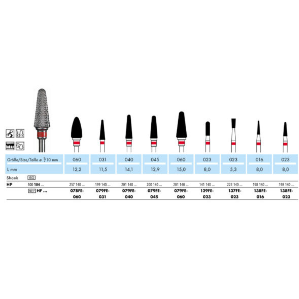 NTI Tungsten Carbide Cutter รหัส HF079FE-060 เป็นหัวกรอคาร์ไบด์ประสิทธิภาพสูงจากประเทศเยอรมนี ออกแบบมาเพื่อรองรับการทำงานในห้องปฏิบัติการทันตกรรม (Dental Laboratory) และการปรับแต่งชิ้นงานนอกช่องปาก (Extra-oral adjustment) ตัวก้านเป็นชนิด HP ที่มีความเที่ยงตรงระดับไมครอน ช่วยยึดเกาะกับ Micromotor ได้อย่างมั่นคงและปลอดภัย