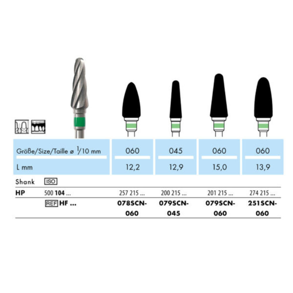 NTI Tungsten Carbide Cutter รหัส HF251SCN-060 เป็นหัวกรอคาร์ไบด์ประสิทธิภาพสูงมาตรฐานเยอรมนี ออกแบบมาเพื่อรองรับการทำงานในห้องปฏิบัติการทันตกรรม (Dental Laboratory) และการปรับแต่งชิ้นงานนอกช่องปาก (Extra-oral adjustment) ตัวก้านเป็นชนิด HP ที่มีความเที่ยงตรงระดับไมครอน ช่วยยึดเกาะกับ Micromotor ได้อย่างมั่นคงและปลอดภัย